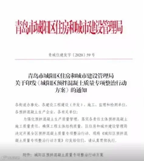 12月9日,青岛城阳区住建局发布关于预拌混凝土质量专项整治的通知,要求对预拌混凝土生产企业和在建项目整治。