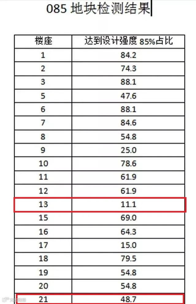 通过鉴定报告得知 :13#栋主体结构混凝土强度推定值达到设计强度85%占比仅为11.1%,21#栋主体结构混凝土强度推定值达到设计强度85%占比仅为48.7%
