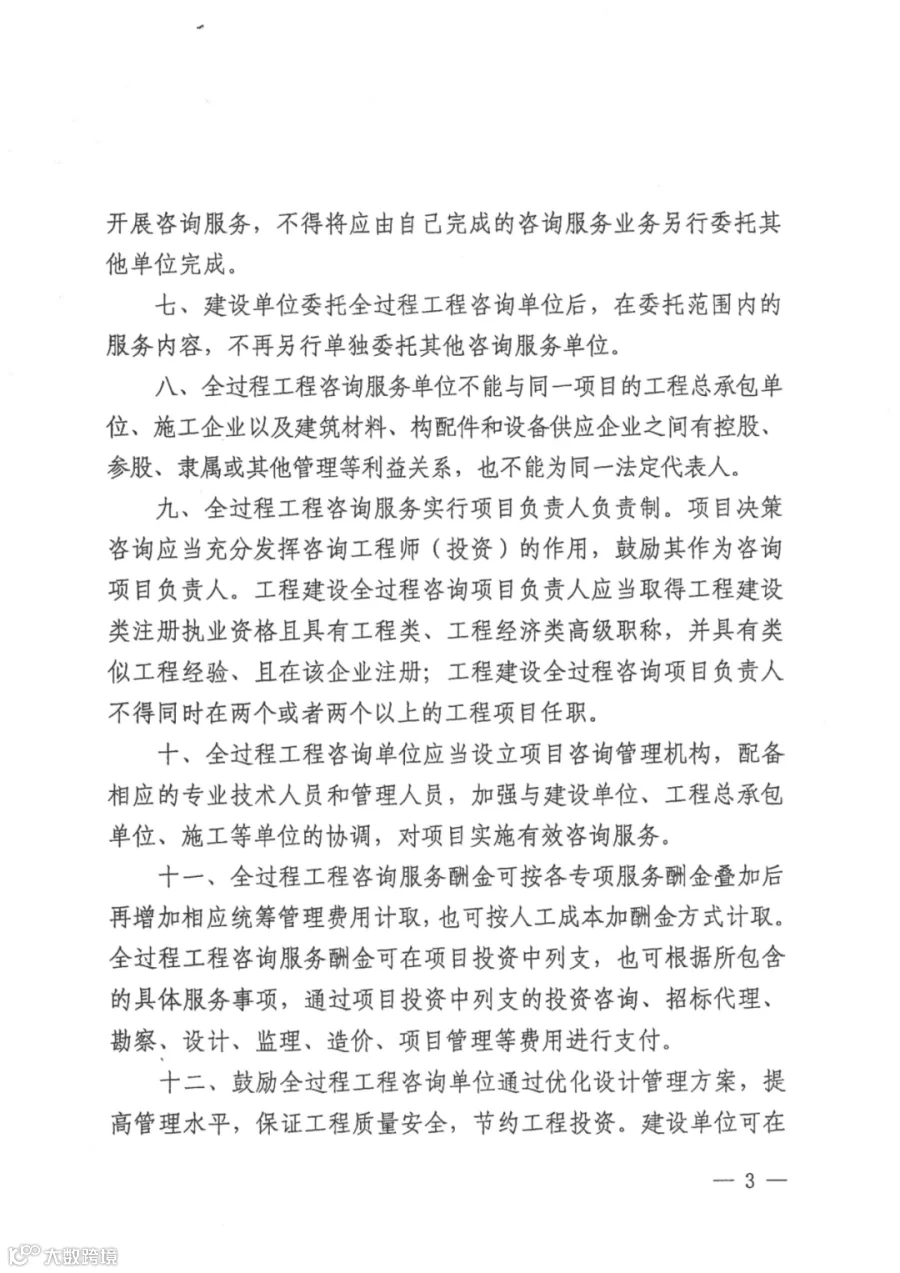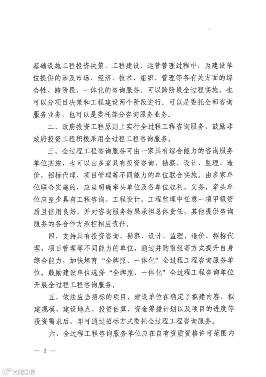 四、鼓励投资咨询、招标代理、勘察、设计、监理、造价、项目管理等企业联合经营、并购重组,培育一批高水平的咨询单位。鼓励建设单位选择具备全牌照、全资质的咨询单位开展全过程工程咨询服务。