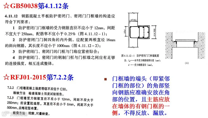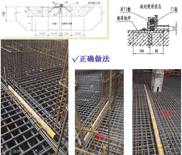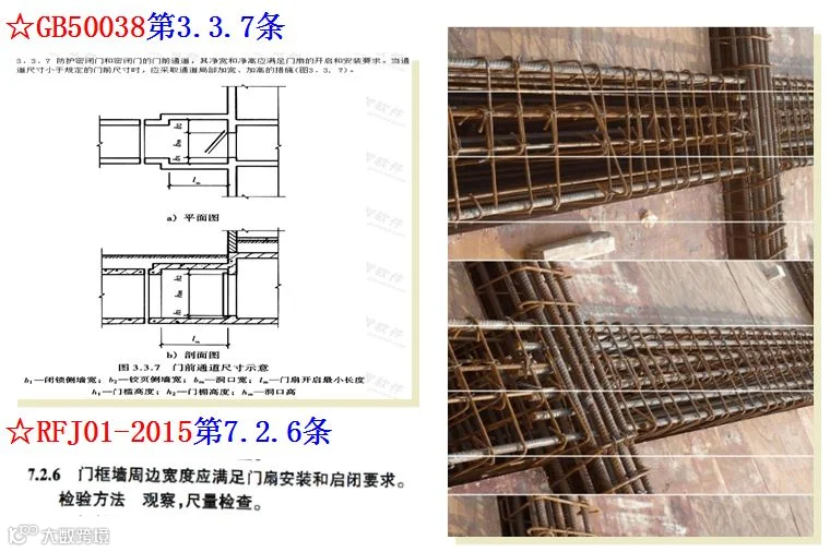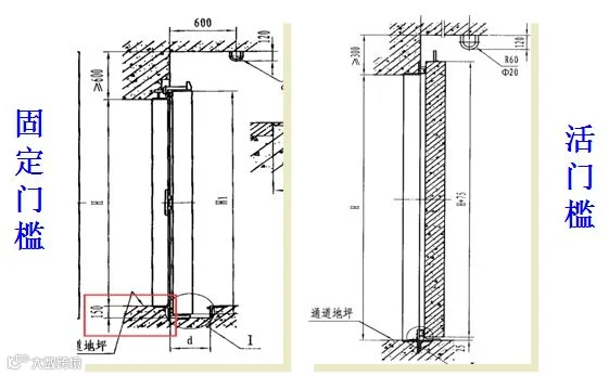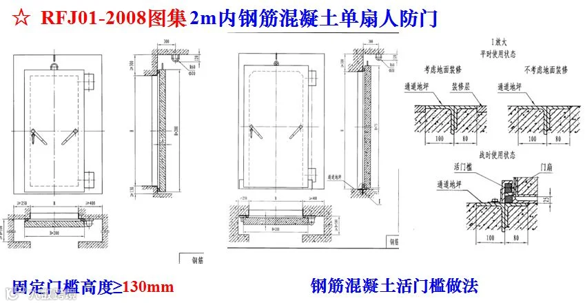 活门槛:门下无门槛,门前大小梁。门框下边与建筑地坪同高,钢筋绑扎高度宜≥100mm。人防门框锚钩应伸入结构层内。