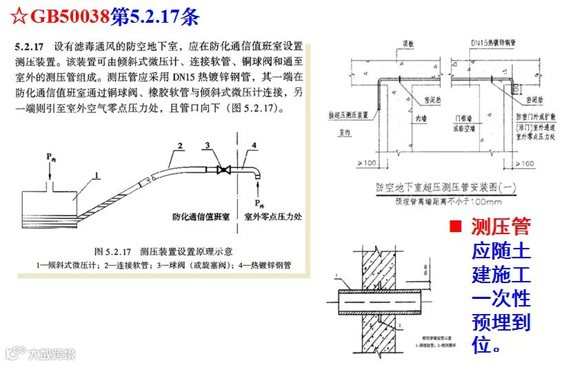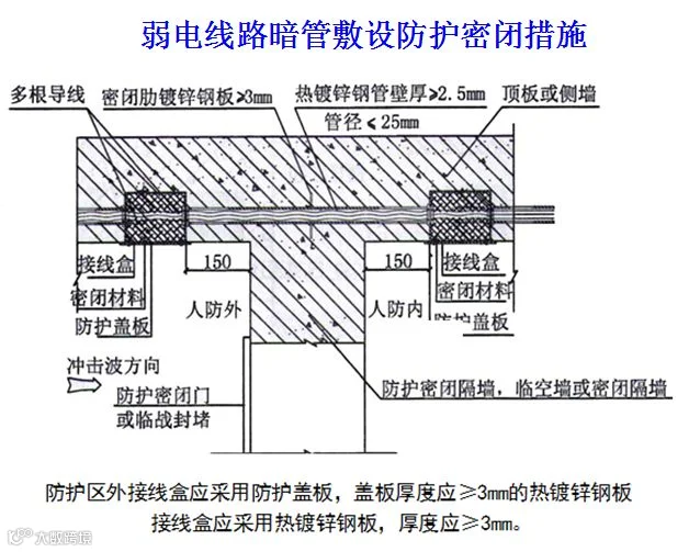 严禁各专业管道未经预埋而直接留洞。同时也禁止排水铸铁管、PVC管等直接埋墙(板)穿过。附建式防空地下室的上部建筑的排水管严禁穿越防空地下室的顶板,而应在顶板上部做处理。(这个矛盾很普遍,设计时可以考虑局部做夹层)