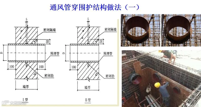 预埋的钢管或钢套管均需双面满焊一道密闭肋(也可理解为较大的止水环),密闭肋的材料为5~10mm厚以上的钢板,肋高50~100mm形状可以是正方形也可以是圆形,先将钢板中间用氧割挖出一个圆洞,洞的直径略大于中间穿管的外管径,然后将密闭肋和中间穿管的接触面双面满焊。完成以上构造后才可浇灌混凝土。