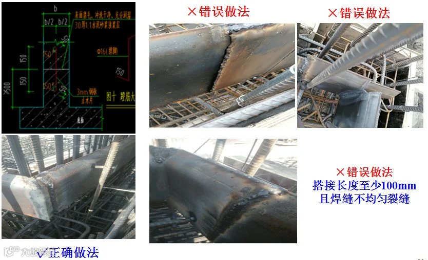 水平搭接长度不宜<100mm,且不少于双面满焊;