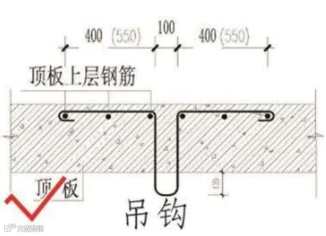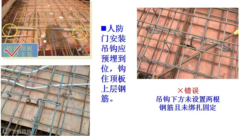 人防门前顶板上应预埋门扇安装用的吊钩,以便门扇的安装和维护。吊钩一般设在门扇中轴线上;钢结构双扇人防门应设置多个吊钩,间距为1000mm。吊钩出墙的距离一般为300~400mm。