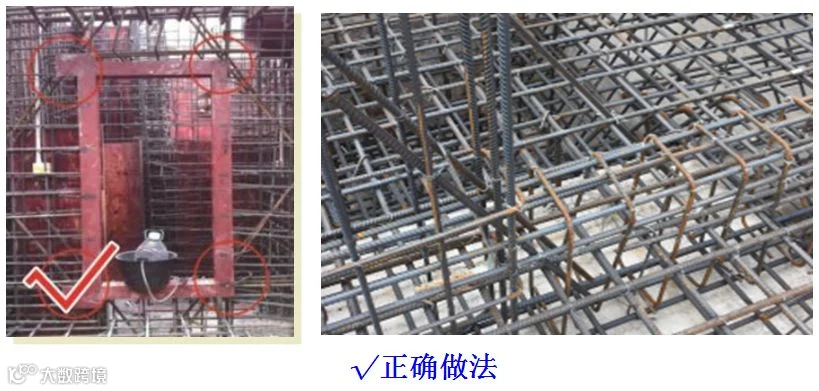 浇筑墙体混凝土之前,应对所有预埋件(钢门框、铰页、锚固板等)的位置进行严格检查;预埋件周边尺寸是否满足要求,特别是门框位置必须准确、垂直度误差不得超过5mm、固定牢固,浇灌混凝土时严防位置移动,门的开启前方不能有柱子、梁等障碍物。