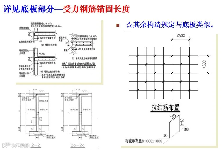 外墙迎水面钢筋的混凝土保护层为直接防水层,厚度不小于50mm(混凝土规范为50mm),防水层厚度不小于30mm。且两排竖向钢筋中:大直径的应放在外侧,小直径的应放在内侧。