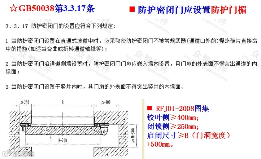 防护密闭门、密闭门:绞叶(转轴)侧门垛长度≥ 400mm;闭锁侧门垛长度≥ 250mm;上档梁≥300mm;固定门槛≥150mm;嵌入墙内深度或保护门楣≥200mm。n防爆波活门:绞叶(转轴)侧门垛长度≥350mm;闭锁侧门垛长度≥ 150mm;上档梁≥300mm;