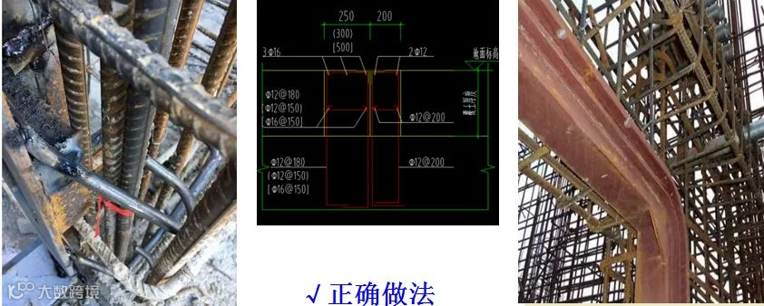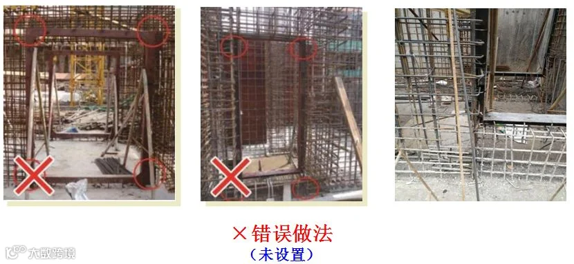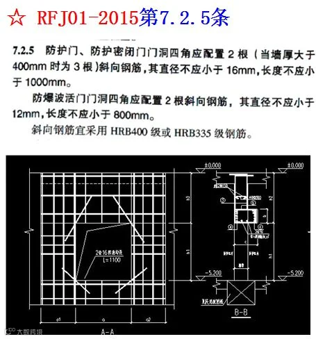人防门洞四角必须设置加强筋:长度1000mm,斜45º绑扎,墙厚≦400mm,每角2φ16;墙厚>400mm,每角3φ16。