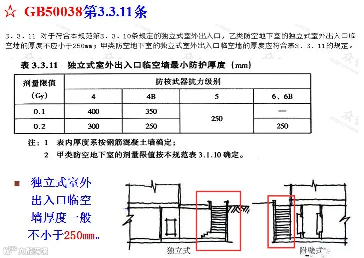 人防地下室外墙厚度不宜小于300mm(250mm结构厚度+50mm保护层厚度)。