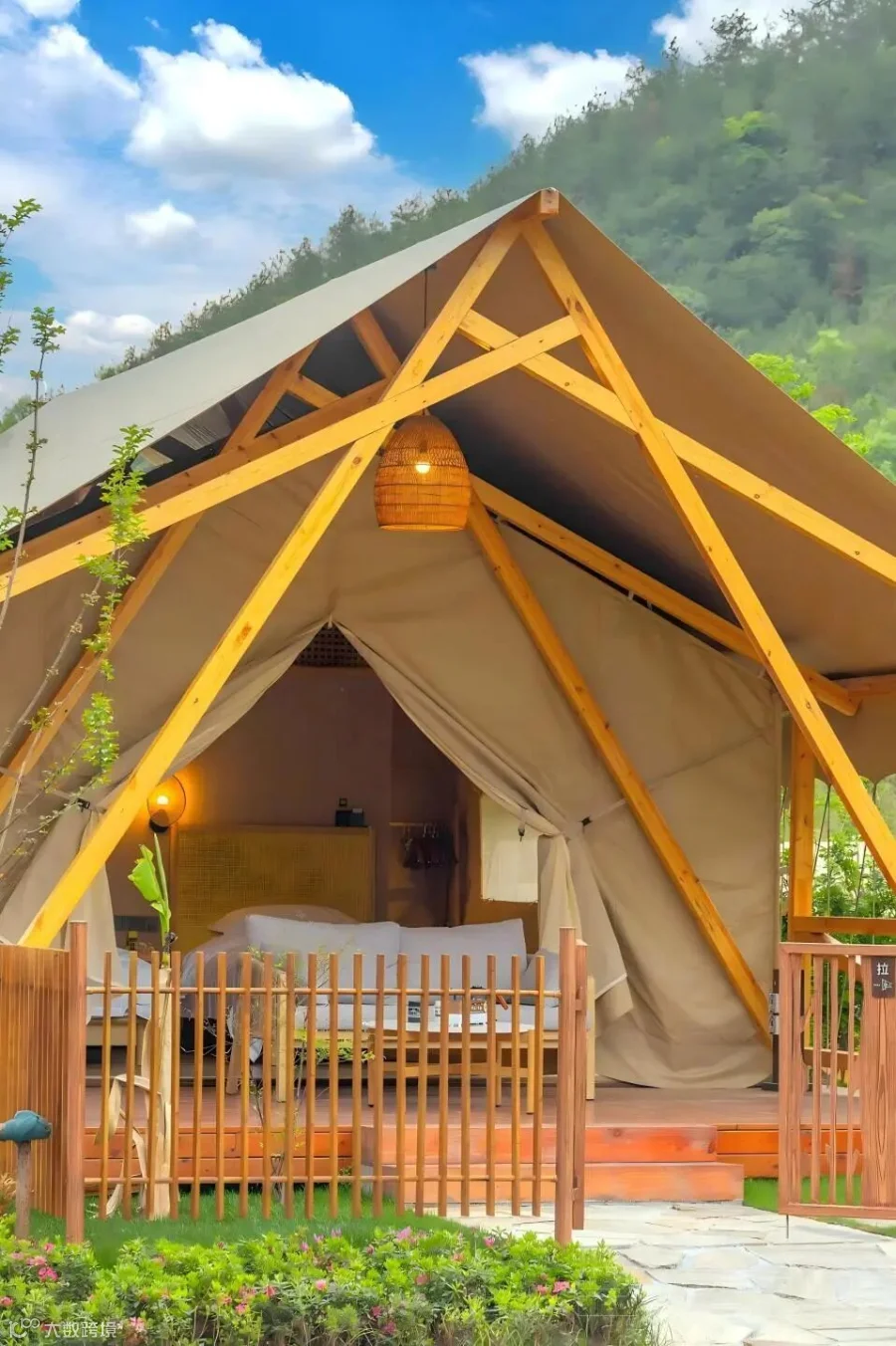 栖谷野奢帐篷酒店隐匿于一片广袤而安宁的绿色山谷之间,以“回归自然,享受野奢”为理念,旨在构建一处原生态自然美学与野奢帐篷交融的户外旅居地,打造更具吸引力的“酒店即文旅目的地”文旅新范式。