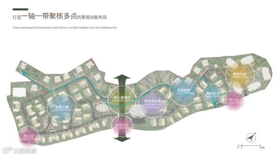 为实现“酒店即文旅目的地”初衷,设计团队在“不改变原生地貌”的基础上,根据山谷地形打造一轴一带聚核多点景观功能布局,通过生态连廊和步道将整片帐篷营地串联起来,让建筑生长和自然景观叠加,体现雅奢“轻介入,重体验”的设计理念。