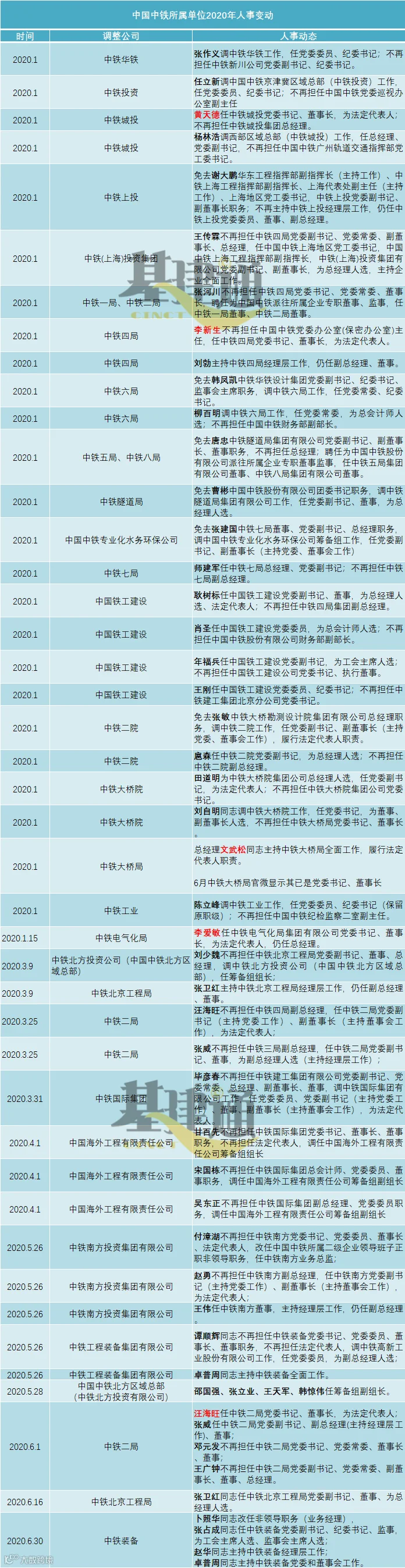 由以上表格可知,有些单位在宣布任免决定的时候并没有明确任命为董事长,而是说明其主持企业全面工作、或者为法定代表人,但据各企业报道消息里的显示来看,中铁(上海)投资集团、中铁二院、中铁大桥局、中铁二局、中铁国际集团、中铁南方投资集团董事长分别就是以上表格里的王传霖、张敏、文武松、汪海旺、毕彦春、赵勇。
