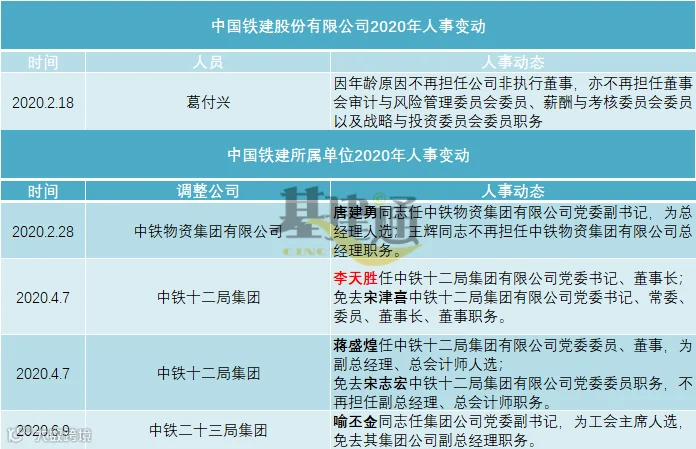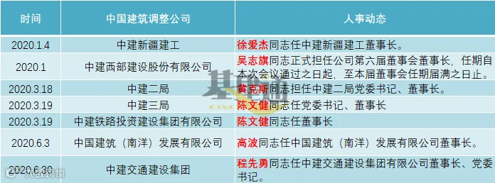 2020年上半年,五大建筑央企除了董事长有调整外,也均有其他高层领导调整,其中中国中铁、中国电建变动较为频繁,其次是中国建筑、中国交建,而变动最少的是中国铁建。