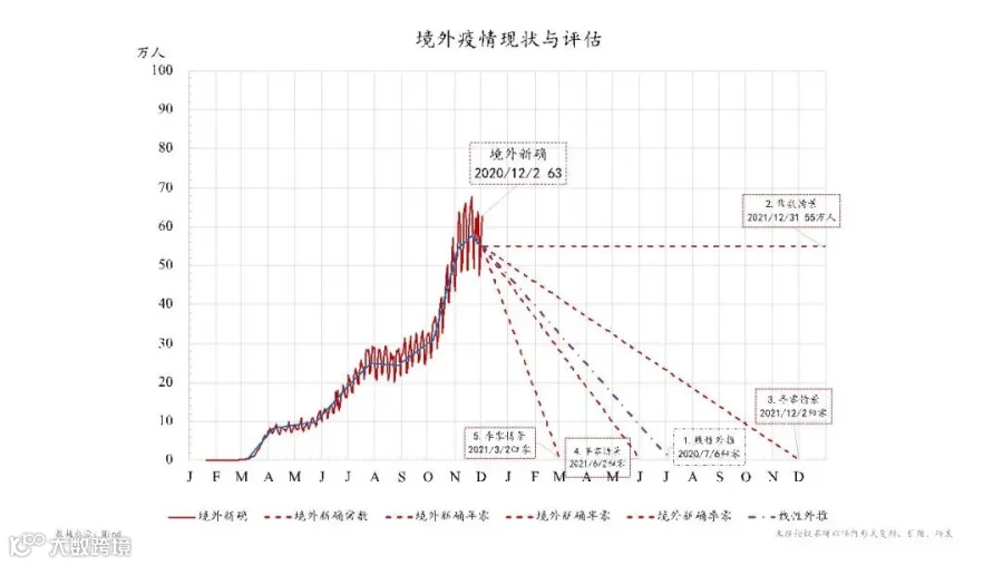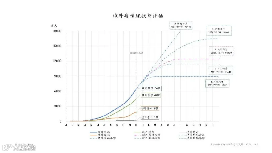 也就是说新冠如果根据现在第三阶段的状况,通过大家的重视、防控和治疗,境外状况也还是可控的。当然图中还有其他的几种可能性,大家可以从图中另外几条线来看。总的来说,防疫是非常重要的任务。