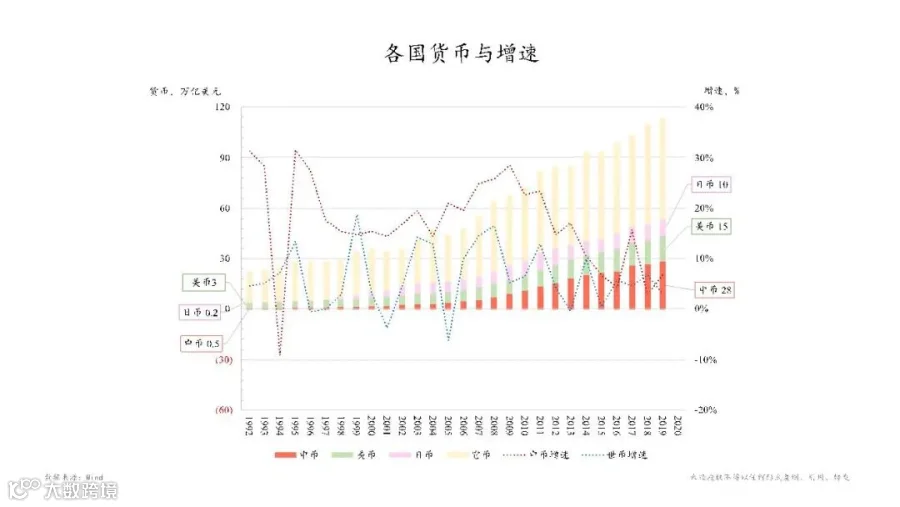 货币是什么?第一层是存款,各种类型存款之和。可以在下面这张图中看到中国的货币也是最高,同时我们货币增长速度也是最快的。