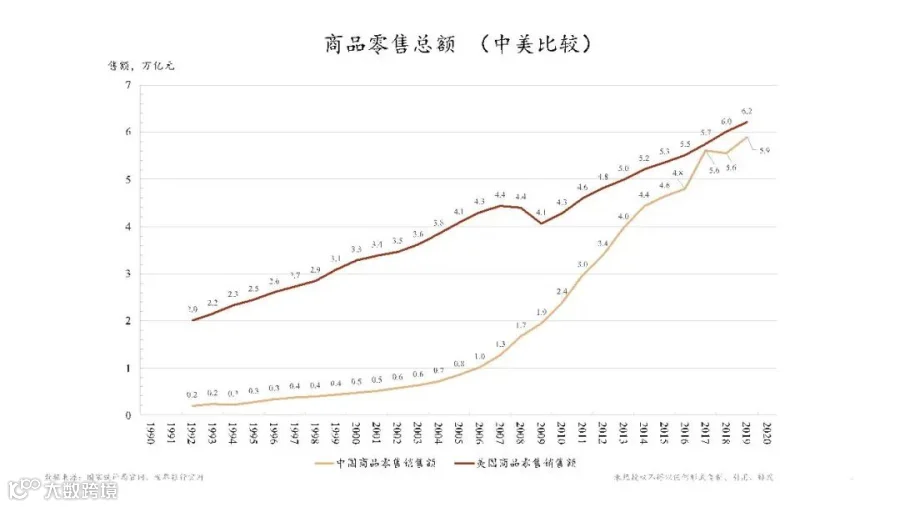 我们再从经济的基本需求之一即商品零售总额的角度来看上面两国的相较情况。我们现在讲内循环,从总规模上讲,中国现在的消费额快速地要追上美国了,也就是说作为一个市场规模来讲,就要到了跟美国几乎一样高的水平。