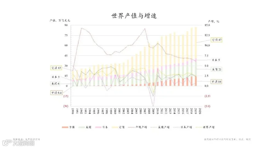 第一张图看看我们从1990年至2019年世界经济总体成长过程,这是一张叠柱图,中间红色的组成部分是我们中国的产值,绿色是美国,粉色是日本,黄色部分是所有的其他国家产值之和。