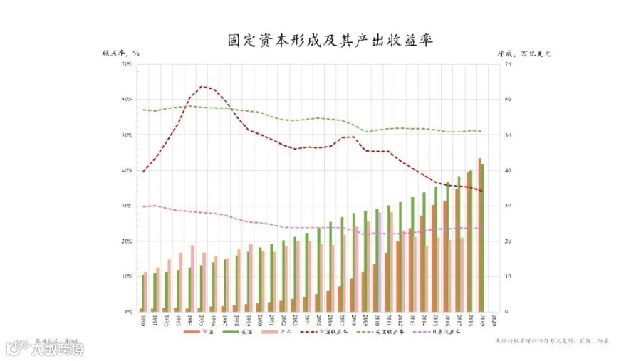 我们再来看一下资产和产出。经济中每年都会一定量的固定资产投资,也称为固定资本形成。图中把中国、美国、日本的资本形成额(方柱)及其产出收益率(虚线)分别地列出来。
