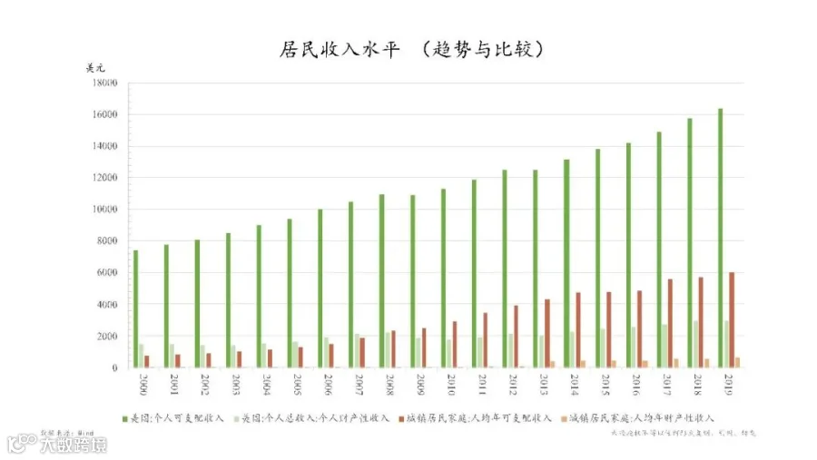 下面这张图是两国的居民收入水平趋势与比较。深绿色柱体代表的是美国人均可支配收入,浅绿色是其中的财产性的收入,也就是存款、股票、债券等这一类的金融收益。