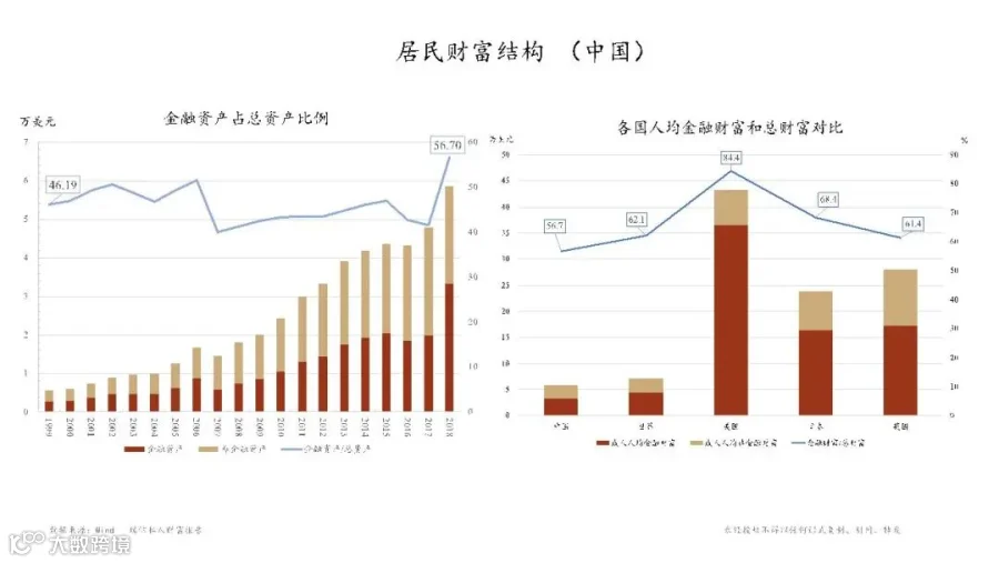 从中国居民的财富结构来看,差不多有一半是非金融产品,近两年金融资产在结构中占比慢慢的超过了一半。右边这张图是2018年各国人均财富结构,其中美国的金融产品的占比是最高。