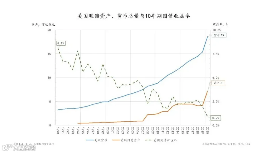 下面这张图中美联储的资产是橘黄色线,美国的货币总量是蓝线,联储资产和货币总量在过去的三十年间都在系统增长。绿色这条虚线还是上图中的那条收益曲线。可以看出货币总量越来越多,国债收益越来越低。