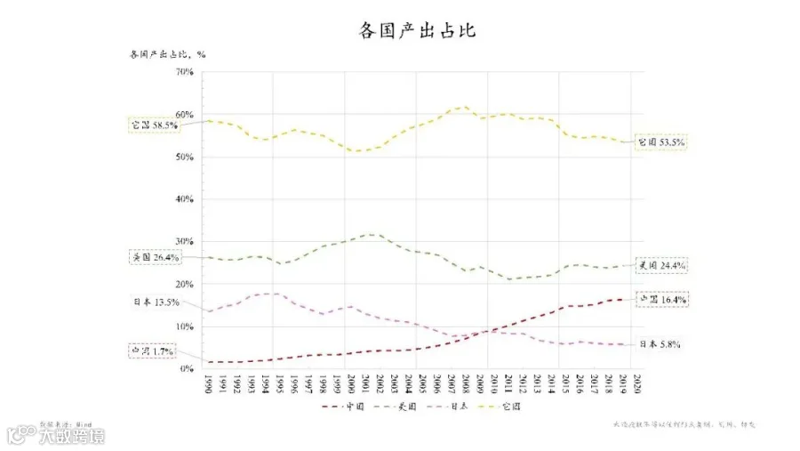 下面这张图是各国产出占比,我们从主要国家占世界经济的占比来看,这里面最突出的也是我们中国,1990年的时候大概只有不到2%,一路发展到2019年大概已占世界产出的16.4%。日本曾经在90年代达到一个高峰,而在世界总量中的占比后面一直呈下滑趋势。