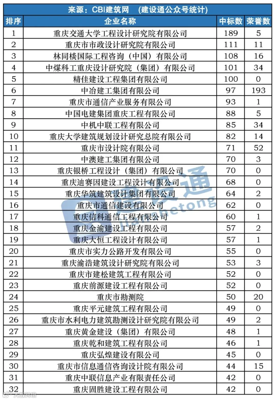 CBI建筑网综合报道:在2020年,重庆建筑施工企业中标数量达14683项,同比(与去年同期)下降2.00%。其中,重庆交通大学工程设计研究院有限公司、重庆市市政设计研究院有限公司、林同棪国际工程咨询(中国)有限公司分列中标数量排行榜前三位。
