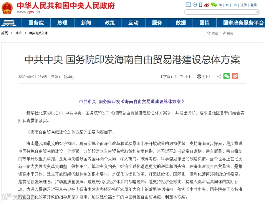 中共中央、国务院6月1日晚印发了《海南自由贸易港建设总体方案》。并配发出通知,要求各地区各部门结合实际认真贯彻落实。从该文件的内容来看,存在十大关键点: