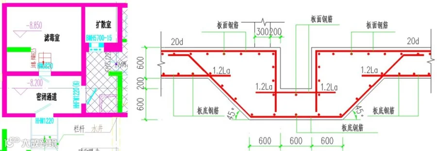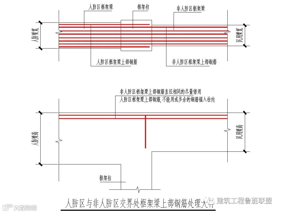 1)人防区内梁板配筋图纸一般由人防院设计,但模板关系(如洞口定位,梁定位、标高)由民用院模板图表达,所以梁板配筋应结合两院图纸施工。