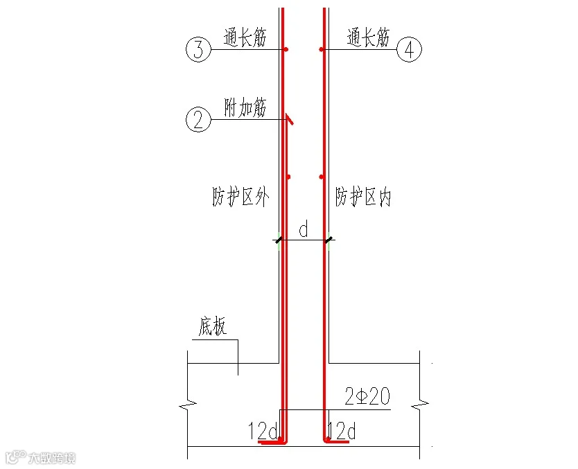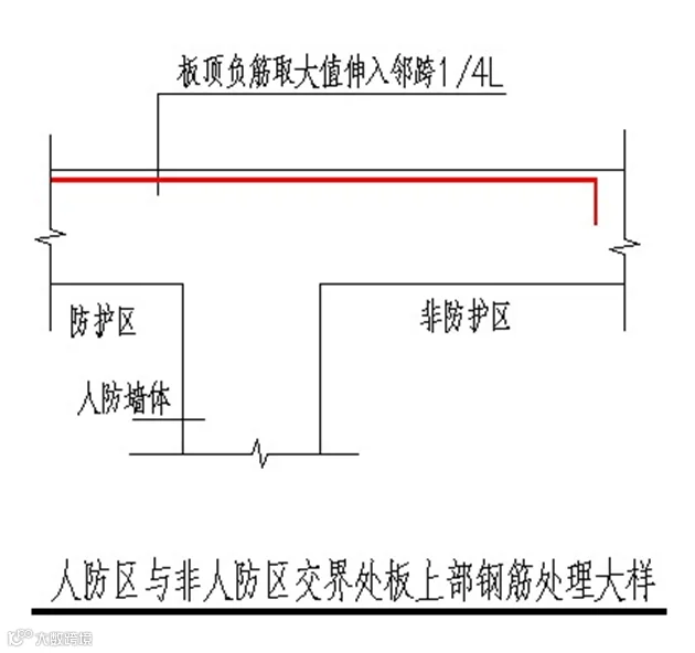 人防墙体钢筋:竖向钢筋应伸至板顶部,未满足者,应加插倒U形钢筋,钢筋规格同原设计,长度为搭接长度Lld。