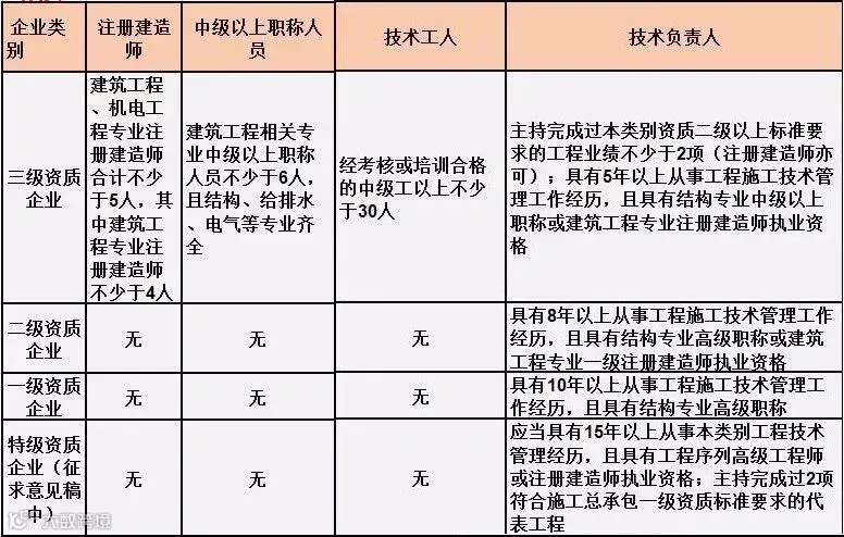 编者说明:以上为当下仍在执行的2007版特级资质标准。2017年6月,住建部印发《施工总承包企业特级资质标准》(征求意见稿),多项内容有较大变动。如要求“企业近三年营业收入均在50亿元以上”、对建筑工程类别的工程业绩增加“工程总承包”、“预制装配式”考核。因仍在征求意见阶段,故暂未列入。