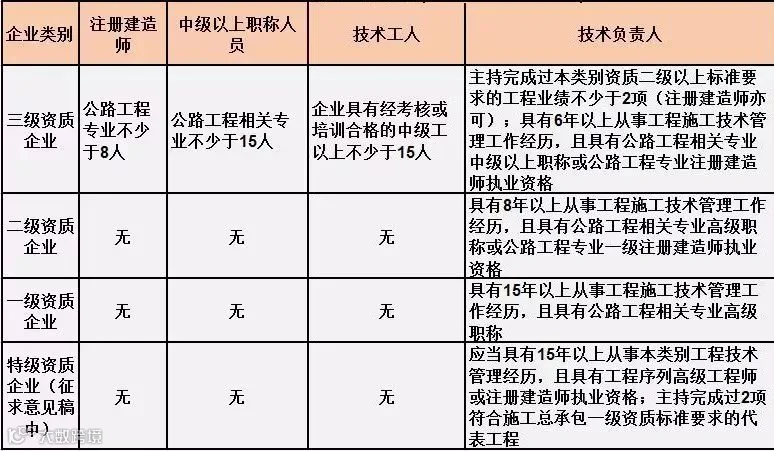 (2)技术负责人具有6年以上从事工程施工技术管理工作经历,且具有公路工程相关专业中级以上职称或公路工程专业注册建造师执业资格;公路工程相关专业中级以上职称人员不少于15人。