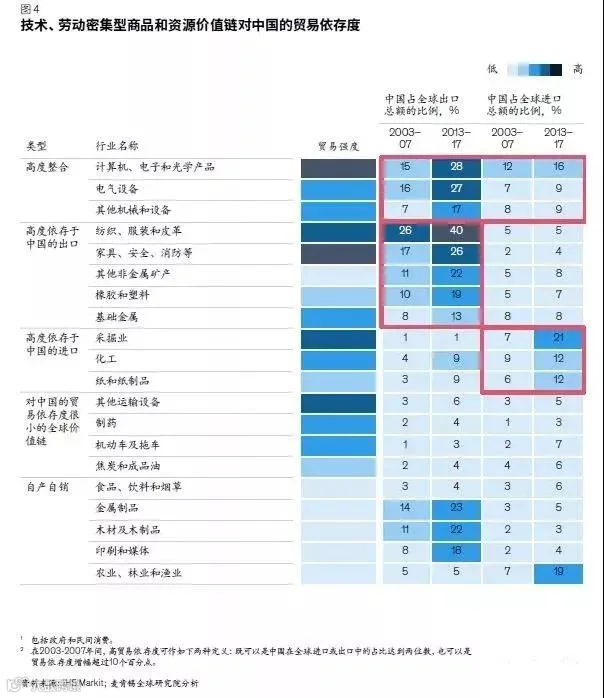 对于贸易属性极高的轻工制造和劳动密集型产业而言,全球各国高度依赖中国的产出。某些行业把中国称为“世界工厂”,生动地表明了全球各国对中国生产的依存度。中国在全球轻工 制造领域(例如纺织和服装)的份额甚至高达52%。在很多情况下,全球各国也高度依赖于中国的出口:中国占据了全球纺织和服装出口的40%,家具出口的26%。