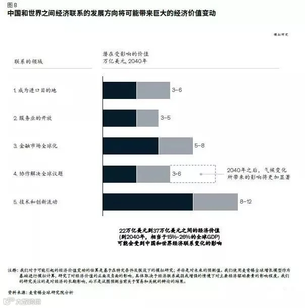 我们使用麦肯锡全球增长模型进行模拟计算,并利用外部研究对结果进行了调整,最终发现:如果上述5项趋势均向加强联系发展,则中国和世界到2040年有望创造巨大的经济价值,而减弱联系则可能令巨大的经济价值面临风险。这种价值绝大部分都表现为对GDP的影响,其余 则表现为其他价值形式,例如在解决气候变化问题时选择不同,将导致社会成本出现或升或降 的分化。到2040年,可能受到影响的总价值或将达到22?37万亿美元,大约相当于全球GDP的 15%~26% (见图8) 。