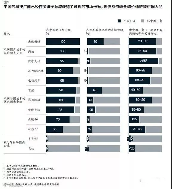 中国在各个行业都在发展本土价值链。中国内需的增长以及国内价值链的发展也在一定程度上解释了近期全球范围内贸易强度的下降。中国正在消费更多其生产的产品。从很多方面来看,中国的技术市场似乎都呈现出本地化的趋势,只是不同行业程度各异。在光伏面板、高铁、数字支付系统和电动汽车这些行业,中国企业在本土市场占据的份额超过90%。而在半导体和飞机制造等行业中,中国企业在国内和国际市场占据的份额都很小,而且高度依赖外国技术。对此次研究的大多数价值链而言,中国仍有很大的全球化潜力。若论全球化程度较高的行业,中国在海外光伏面板市场占据了高达50%的份额;若论全球化程度不足的行业,中国在飞机制造行业的市场份额尚不及1%(见图5)。