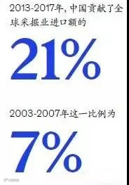 随着中国的工业化不断取得进展,全球上游产业对中国的依存度均有所提高。那些为进一步加工提供原材料的行业都要依赖中国的进口。中国制造业的增长大幅提升了对原材 料和中间品(用于加工成最终商品)的需求,人均收入的增长也推升了中国的整体商品需求。2003-2007年间,中国贡献了全球采掘业进口额的7%,在2013-2017年间这一比例更升高到21%。