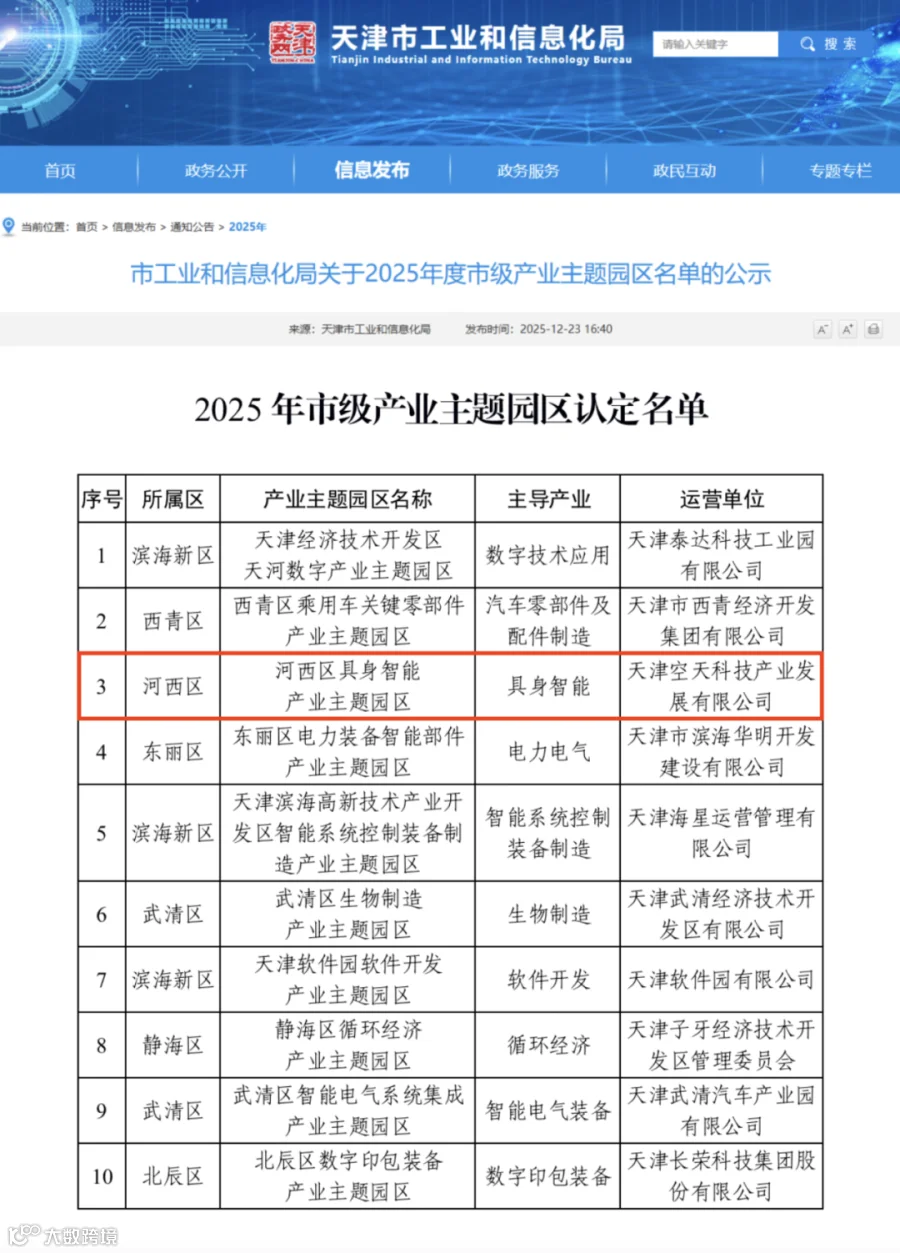近日,天津市工业和信息化局正式公示 2025 年度市级产业主题园区名单,天津空天数字产业园凭借在具身智能产业的清晰定位、显著的产业集聚效应与创新的服务体系获评“河西区具身智能产业主题园区”。这是对园区聚焦新质生产力前沿领域、深耕产业培育成果的官方认可,也是天津市前瞻布局未来产业、推动工业遗存转型升级的重要实践。