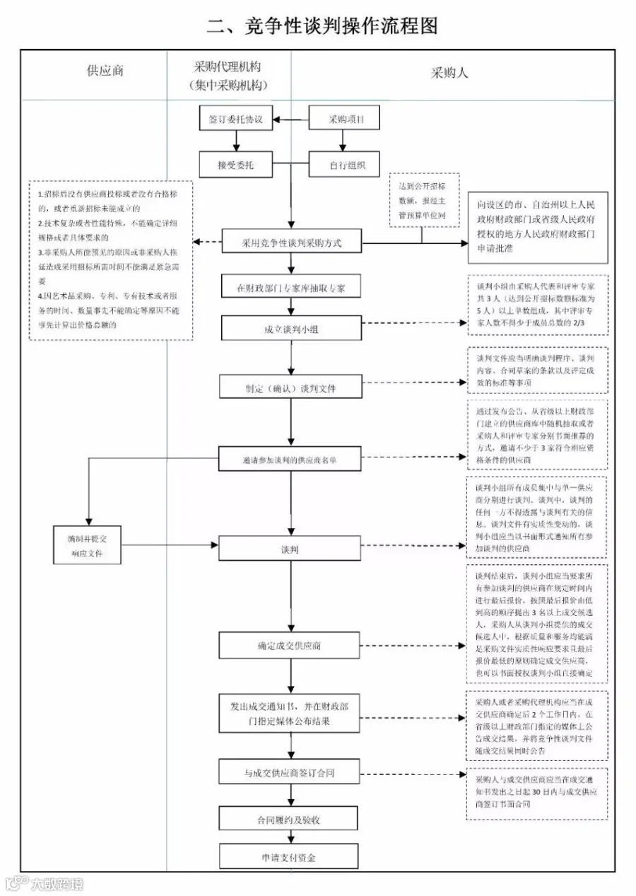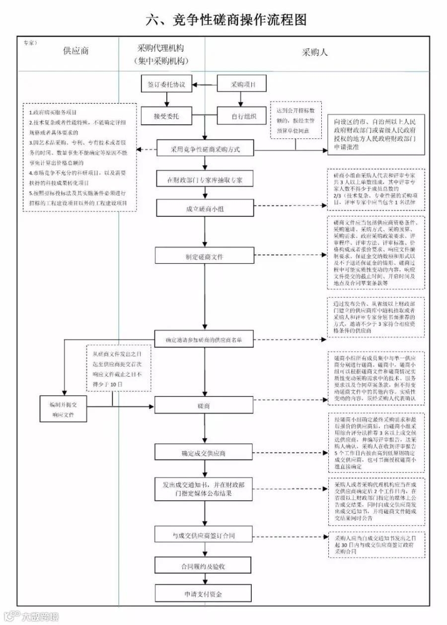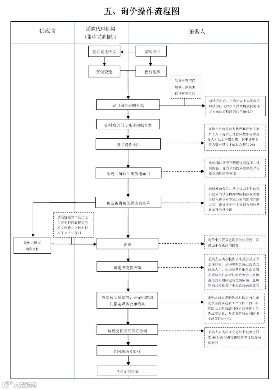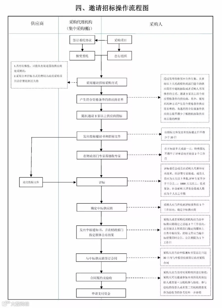 流程图中,对供应商、采购代理机构(集中采购机构)和采购人参与的流程进行了明确。有关当事人看到流程图,便可以清晰地知道自己在完成政府采购项目中需要参与的环节。