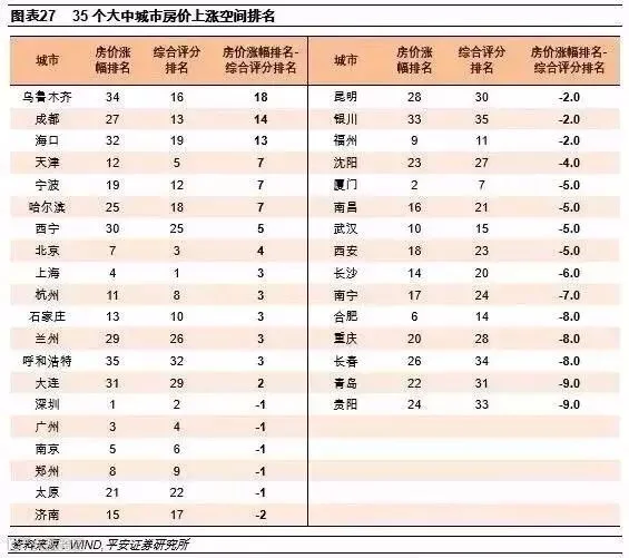 再次,我们通过对比房价累计涨幅与该城市房地产基本面的强弱,来筛选未来房价仍有上涨空间的“潜力股”。我们将过去两轮周期中35个大中城市的房价累计涨幅排名,与各个城市房地产基本面排名两者计算差值,试图得到那些基本面排名比较靠前,但房价涨幅相对靠后的城市,也即房价仍有上涨潜力的城市排名。