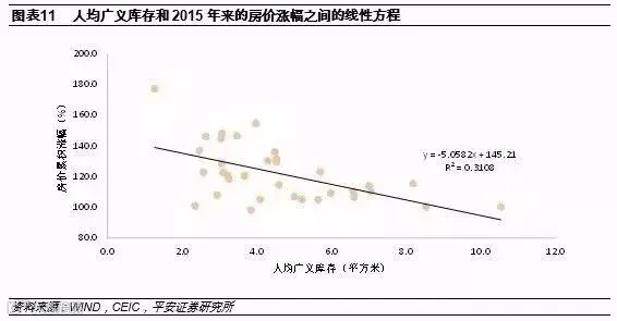 总的来看,在这四项库存指标里,人均广义库存与房价涨幅之间的负相关性最为显著。
