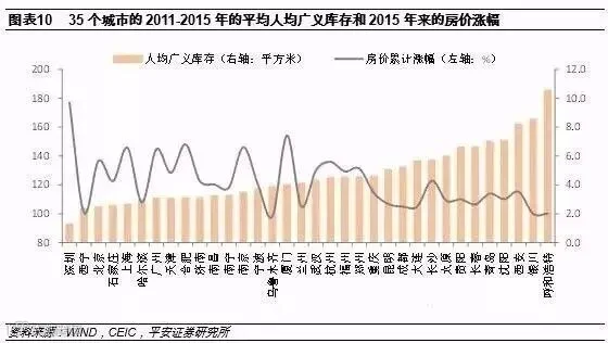 理论上,库存越低的城市,在其它条件不变的情况下,房价涨幅越高。我们选取35个大中城市的房价和库存数据进行分析:房价的累积涨幅为2015年1月到2017年6月的累积涨幅(本轮周期),狭义和广义库存均为2011年-2015年的累计值,人均狭义和广义库存为2011年-2015年的平均值。
