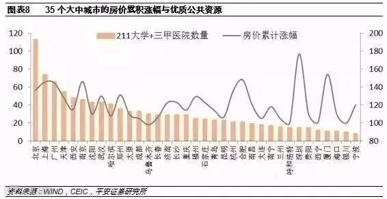 我们选取了35个大中城市在本轮房价周期中(2015年1月到2017年6月)新建住宅价格的累计涨幅,以及各城市的211大学数量+三甲医院数量进行对比,得出的结论是:房价的上涨幅度与该地区211大学数量+三甲医院数量具有较为明显的正相关关系。