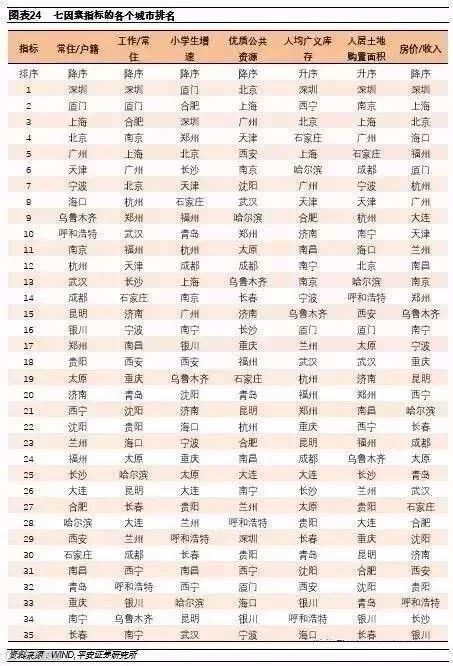 首先,我们根据房价驱动因素的分析,测算各城市房地产基本面的情况。根据上述分析,我们认为常住人口/户籍人口,工作人口/常住人口,小学生在校人数增速,优质公共资源数量,人均广义库存,人均土地购置面积,以及房价收入比可以较好的解释不同城市本轮房地产价格分化。我们将这七个因素作为评价指标,每项指标各个城市的排名如下: