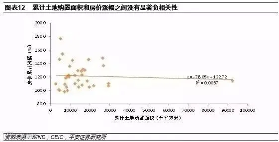 土地购置面积与房价涨幅没有显著的负相关性。尽管从极端值来看,土地供给大幅高于其他城市的重庆,房价涨幅的确较低;但2015年以来房价涨幅较高的城市中,只有深圳和厦门的累计土地购置面积相对较低。