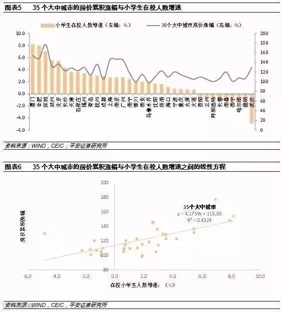 选取35个大中城市在本轮房价周期中(2015年1月到2017年6月)新建住宅价格的累计涨幅,以及各城市2011年-2015年间小学生的在校人数增速的均值进行对比,可知:房价的上涨幅度与该地区新增小学生在校人数增速正相关。
