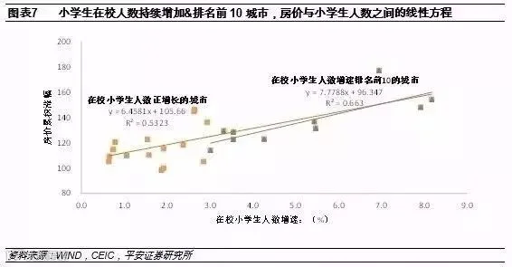如果我们只观察35个大中城市小学生在校人数增速前十的城市,具体包括厦门、合肥、深圳、郑州、北京、长沙、天津、石家庄、福州和青岛,回归方程的拟合优度进一步提高到0.663,房价涨幅对小学生在校人数增速的弹性上升到7.8。也即是说,对于小学生在校人数持续增加的城市,小学生在校人数增速每增加1个百分点,推动房价上涨7.8个百分点。