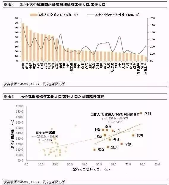 我们选取了35个大中城市在本轮房价周期中(2015年1月到2017年6月)新建住宅价格的累计涨幅,以及各城市2011年-2015年间的工作人口/常住人口比例的均值进行对比,得出的结论是:房价的上涨幅度与该地区工作人口/常住人口比例具有较为明显的正相关关系。