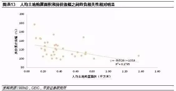 人均土地购置面积与房价涨幅具有显著的负相关性。35个大中城市的平均人均土地购置面积为0.4平方米,房价涨幅较高的城市,如深圳、南京、上海等城市的人均土地购置面积远远低于该水平。尤其是深圳,人均土地购置面积不足0.1平方米,在所有城市中是最低水平,其房价涨幅也最高。