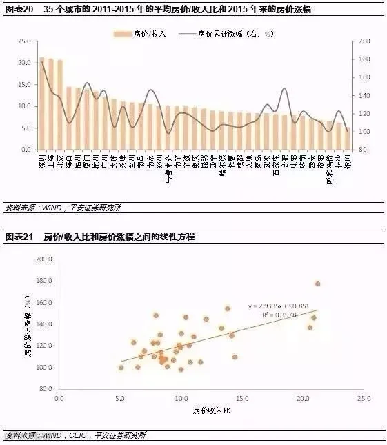 与前文类似,我们同样使用本轮周期的累计房价涨幅(2015年1月到2017年6月),以及2011-2015年各城市房价收入比的均值来进行分析,得出的结论是: