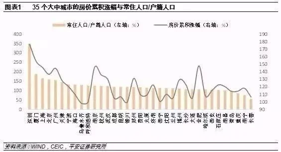 我们选取了35个大中城市在本轮房价周期中(2015年1月到2017年6月)新建住宅价格的累计涨幅,以及各城市2011年-2015年间的常住人口/户籍人口比例的均值,作为对比和考察的指标。得出的结论是:房价的上涨幅度与该地区常住人口/户籍人口的比例具有明显的正相关关系。